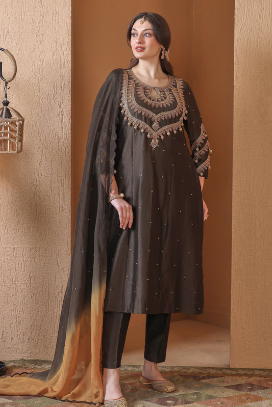 Ready To ShipSeed Pearl U-cut Kurta Set - BROWN