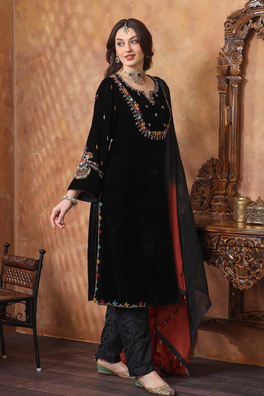 Ready To ShipsVelvet Farshi Suit With Beads Embroidery - BLACK