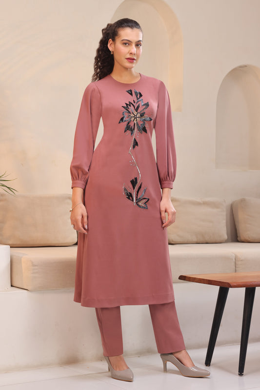 Ready To Ships3D Leaves Embroidery Co-ord Set - DUSTY ROSE