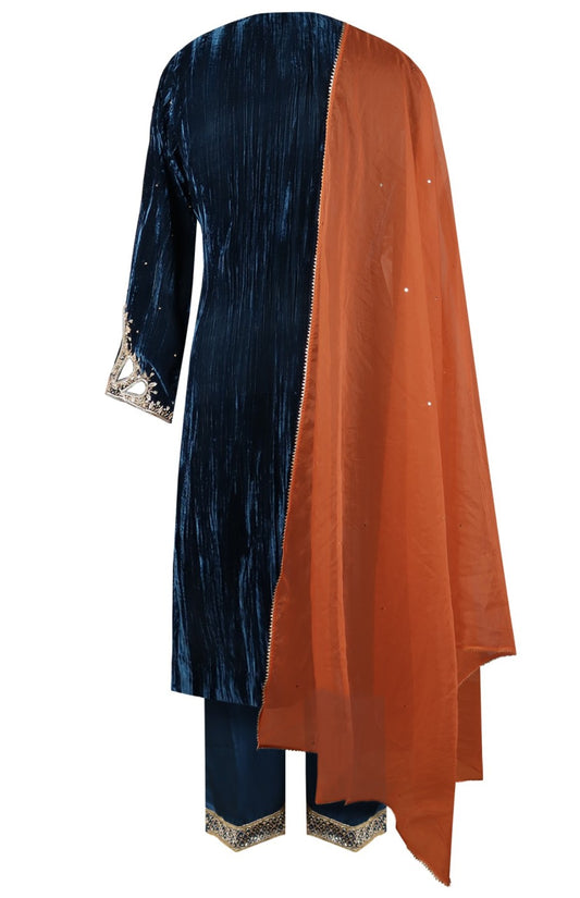 Ready To ShipCrinkled Velvet Suit With Cutwork - INDIGO