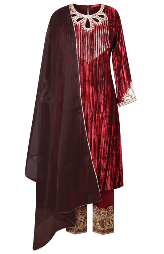 Ready To ShipsCrinkled Velvet Suit With Cutwork - INDIGO