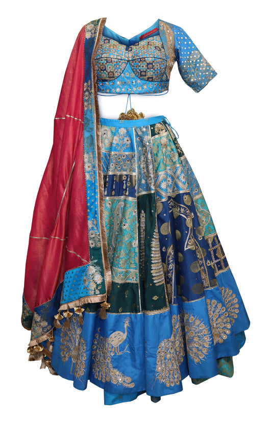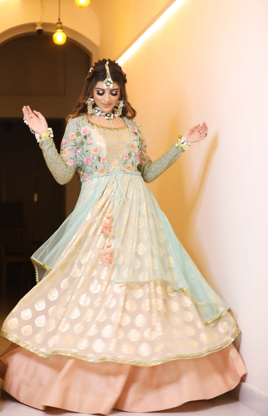 Ferozi Tulle Jacket With Foil Anarkali And Silk Lehnga