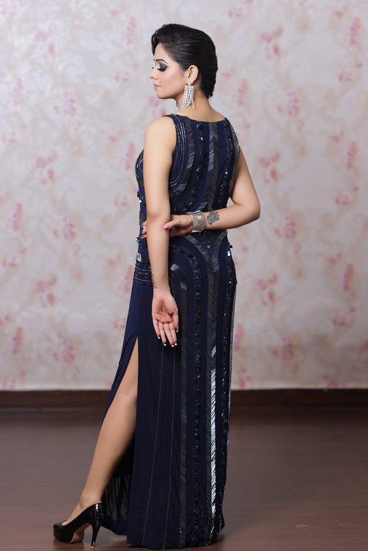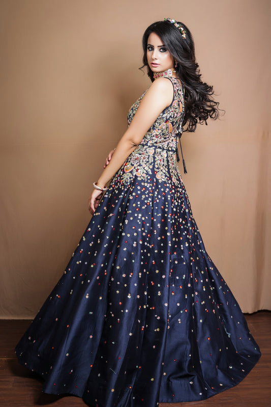 Navy Blue Gown With Multicoloured Sequins Embroidery