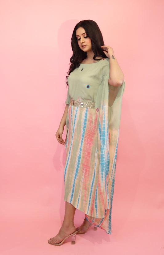 Tie & Dye Kaftan With Mirror Work Belt - SAGE GREEN