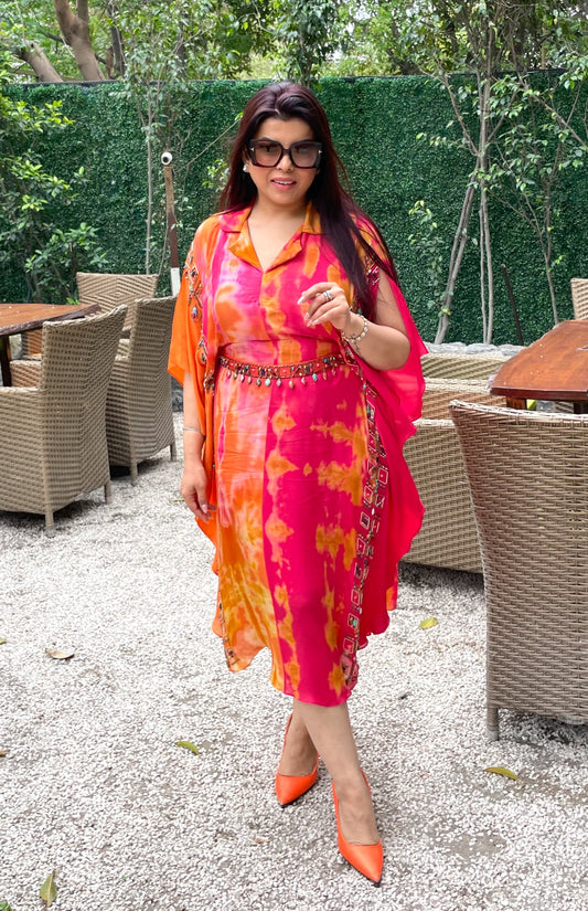 Tie n Dye Chiffon Kaftan - HOT PINK/ORANGE