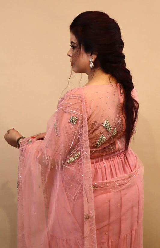 Ready To ShipTiered Saree With Rhinestone Embroidery - PINK