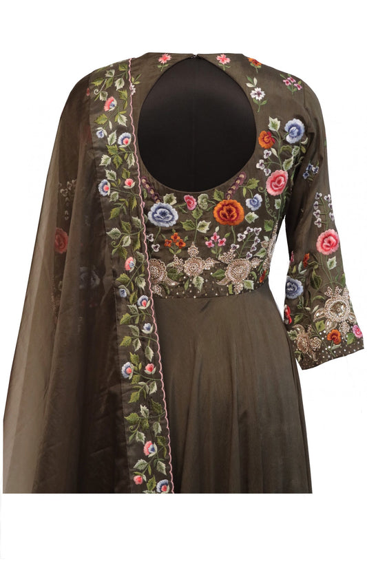 Ready To ShipAppliqué Embroidery Kora Silk Anarkali - MOCHA