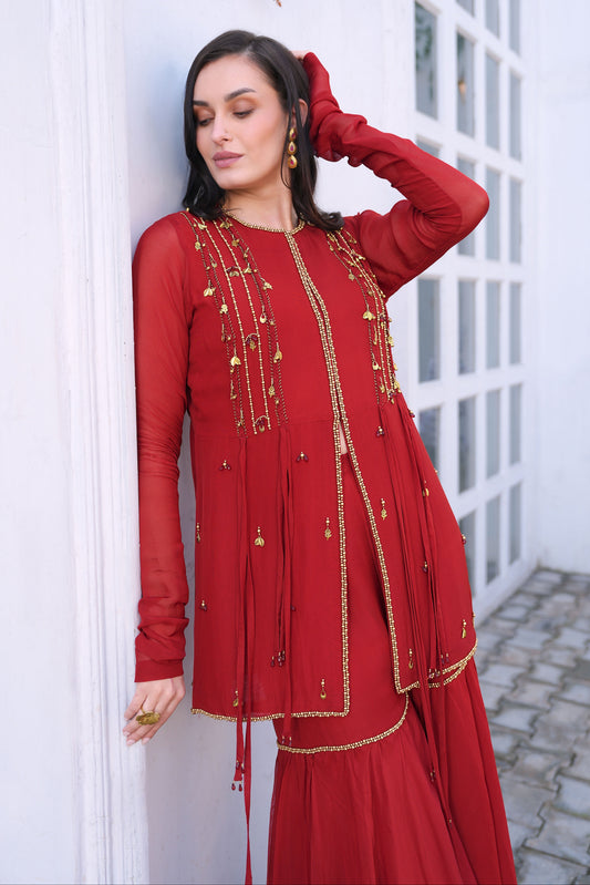 Pearl & Mirror Work Sharara Suit - OLD ROSE