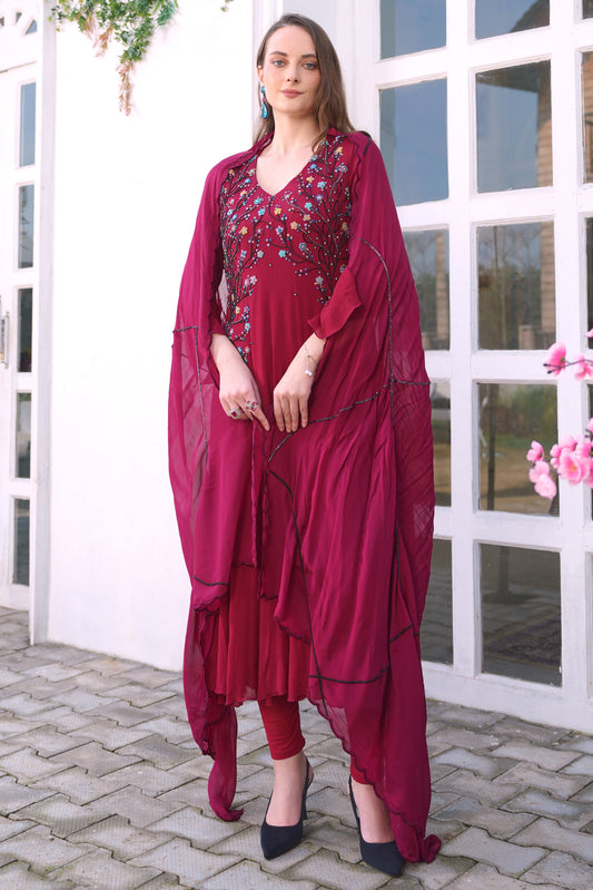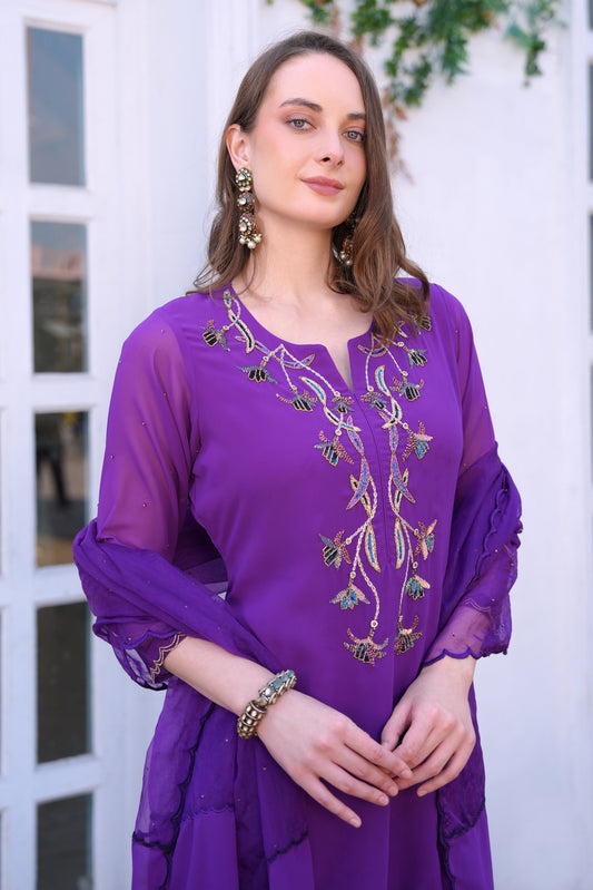 Chiffon Anarkali With TonT Embroidery - DARK PLUM