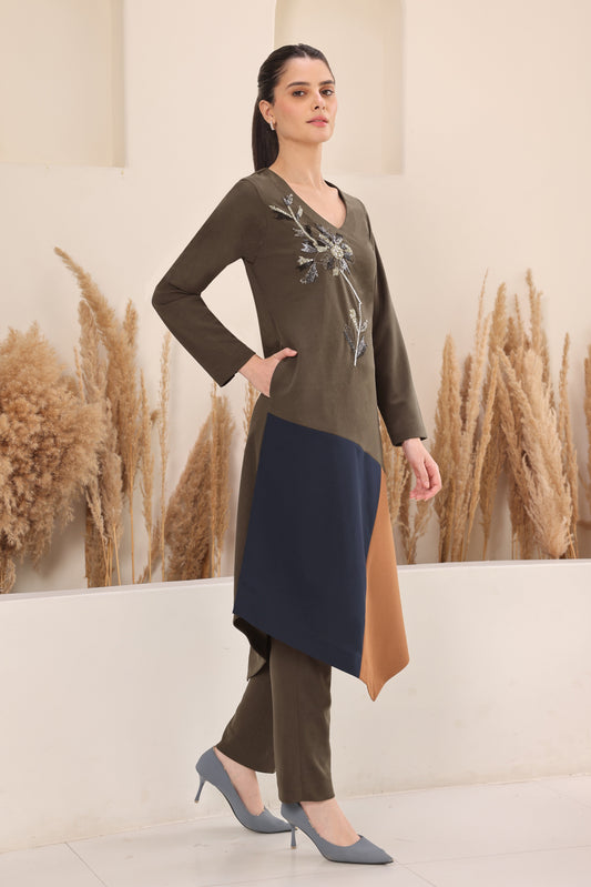 SaleReady To ShipDaisy Colour Block Kurta Set - OLIVE
