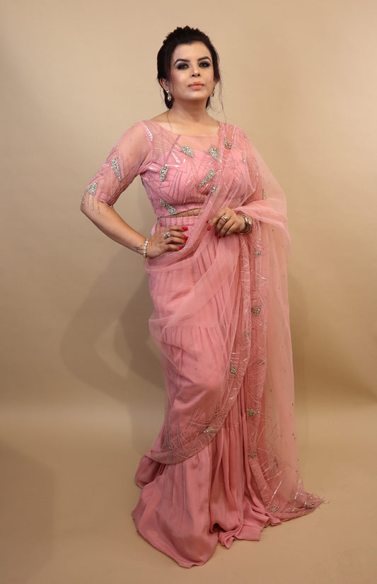 Ready To ShipTiered Saree With Rhinestone Embroidery - PINK