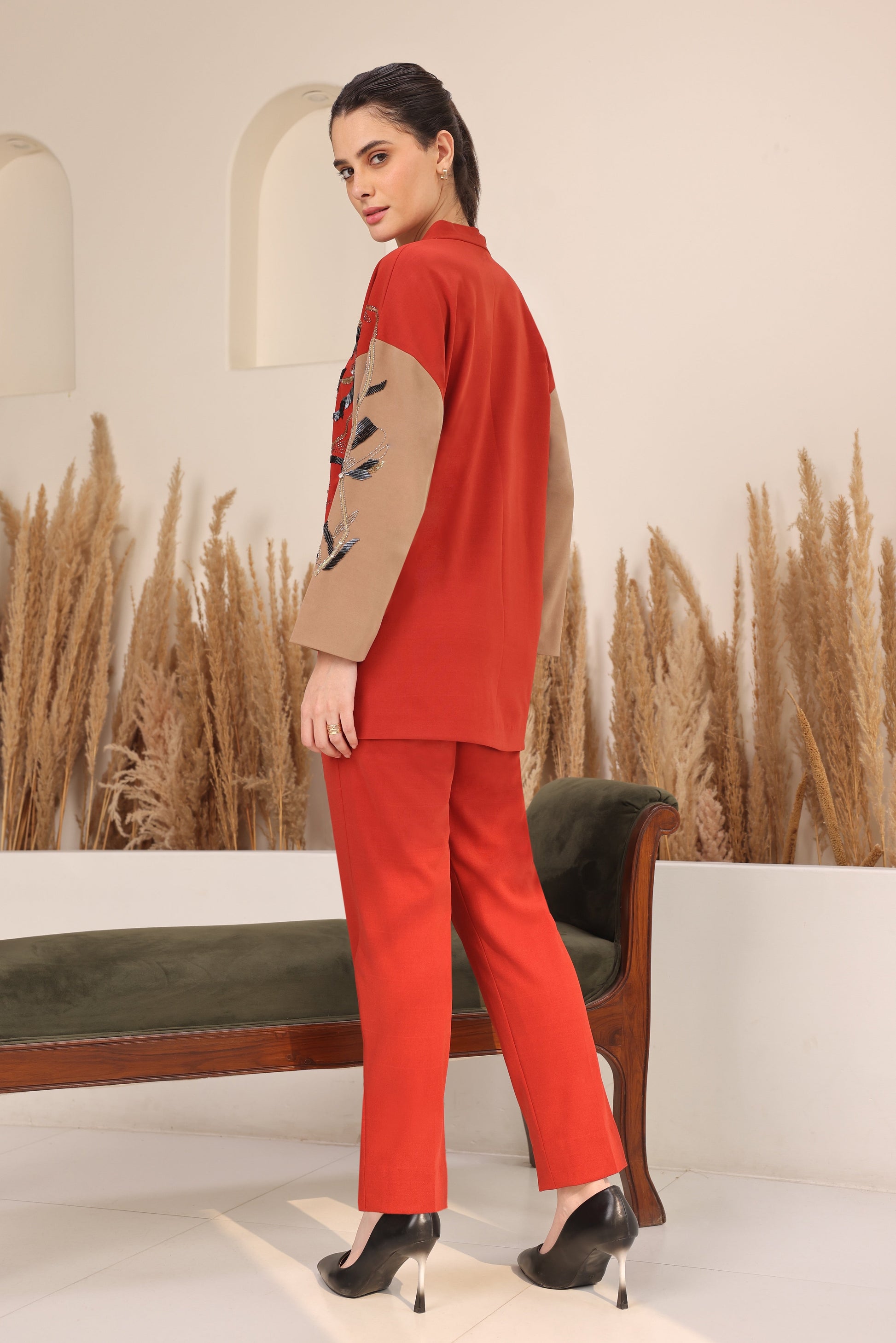 Our Daisy Batwing Co-ord Set, crafted from soft and stretchable elastane spandex fabric, features relaxed batwing sleeves that create a fluid drape across the upper body, offering ease of movement and a flattering fit for those with fuller busts, apple-shaped, and pear-shaped body types. Intricate floral motifs in glass and nalki embroidery adorn the front, adding a subtle shimmer to the look. Paired with straight-fit pants in the same fabric, this co-ord set is perfect for semi-formal occasions, winter gatherings, or effortlessly elevated everyday wear.