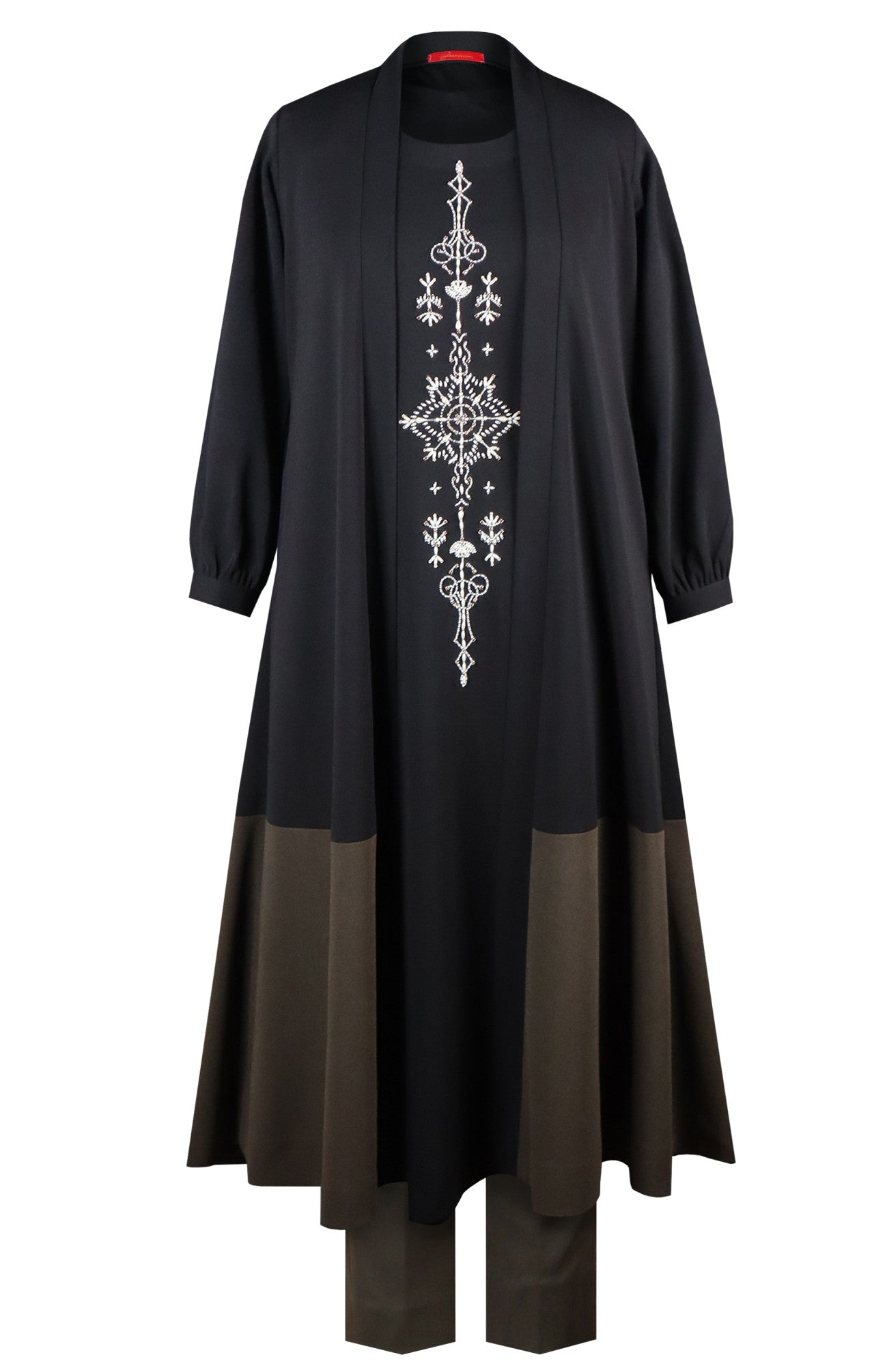 This 3-piece Turkish Motif Long Cape Kurta Set, crafted from soft elastane spandex, features intricate Turkish-inspired pearl embroidery. The set includes a kurta, a flowy cape, and tailored pants, creating a graceful layered silhouette that flatters all body types. Lightweight and comfortable, this semi-formal winter kurta set for women is perfect for special gatherings or outings.